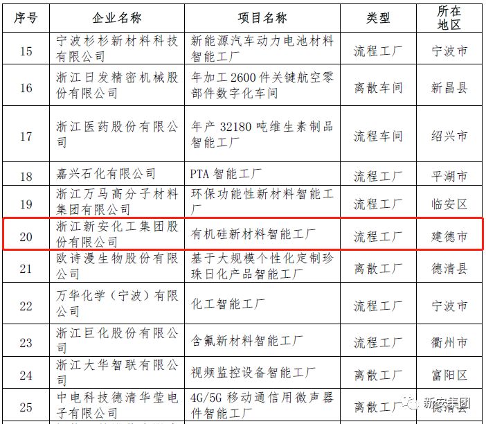 此次获得浙江省经信厅认定的新安集团有机硅新材料智能工厂,实现对物流、能流、物性、资产的全流程监控,建立生产过程数据自动采集和分析系统,生产工艺数据自动数采率达到90%以上。