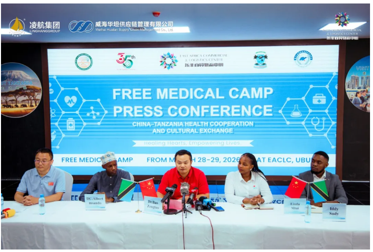 2026年3月23日,“中非人文交流心连心,援外医疗义诊手牵手”东非商贸物流中心爱心义诊活动新闻发布会顺利举办。坦桑尼亚乌本戈区区长阿尔伯特·姆桑多,中国(江苏)第35批援桑给巴尔医疗队队长包增涛,中国(山东)第27批援坦桑尼亚医疗队队长张凯出席发布会,现场正式官宣本次爱心义诊活动的详细安排,为在坦华人华侨及坦桑尼亚本地民众送上免费医疗服务。